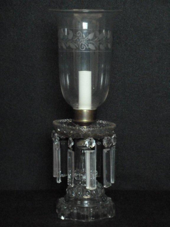 A pair of etched hurricane shade candlesticks